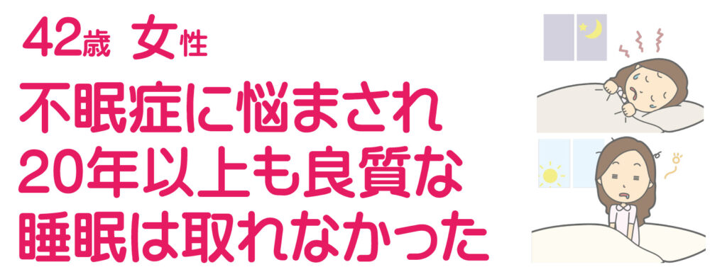 - 始めて2週間で睡眠薬を使わなくても、ぐっすり眠れて元気になり性格までもが明るくなりました